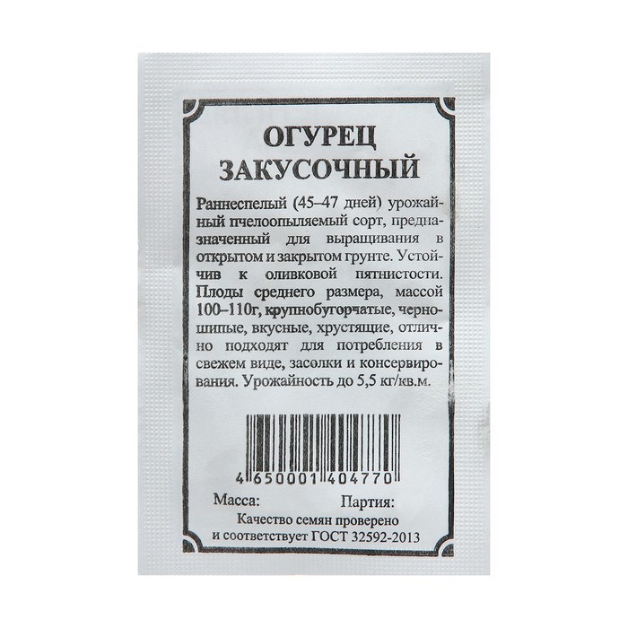 Сорт , пчелоопыляемый, салатный, консервный. Предназначен для выращивания в открытом грунте, период от всходов до первого сбора плодов 34 – 42 дня. Образует крупнобугорчатые цилиндрические плоды, зеленого цвета с короткими полосами, средней длины и короткие. Обладает отличными вкусовыми качествами. Сорт отличается устойчивостью к оливковой пятнистости.